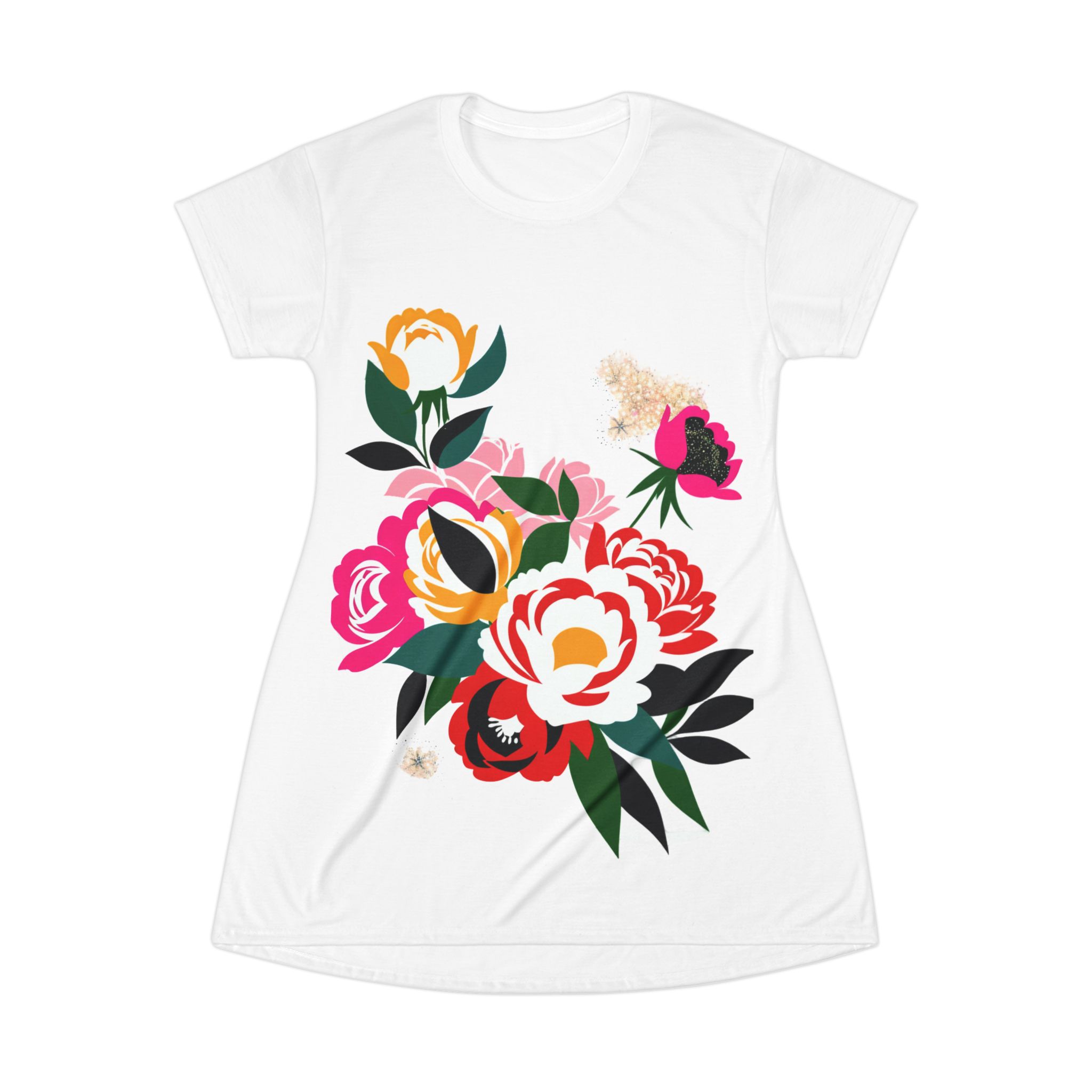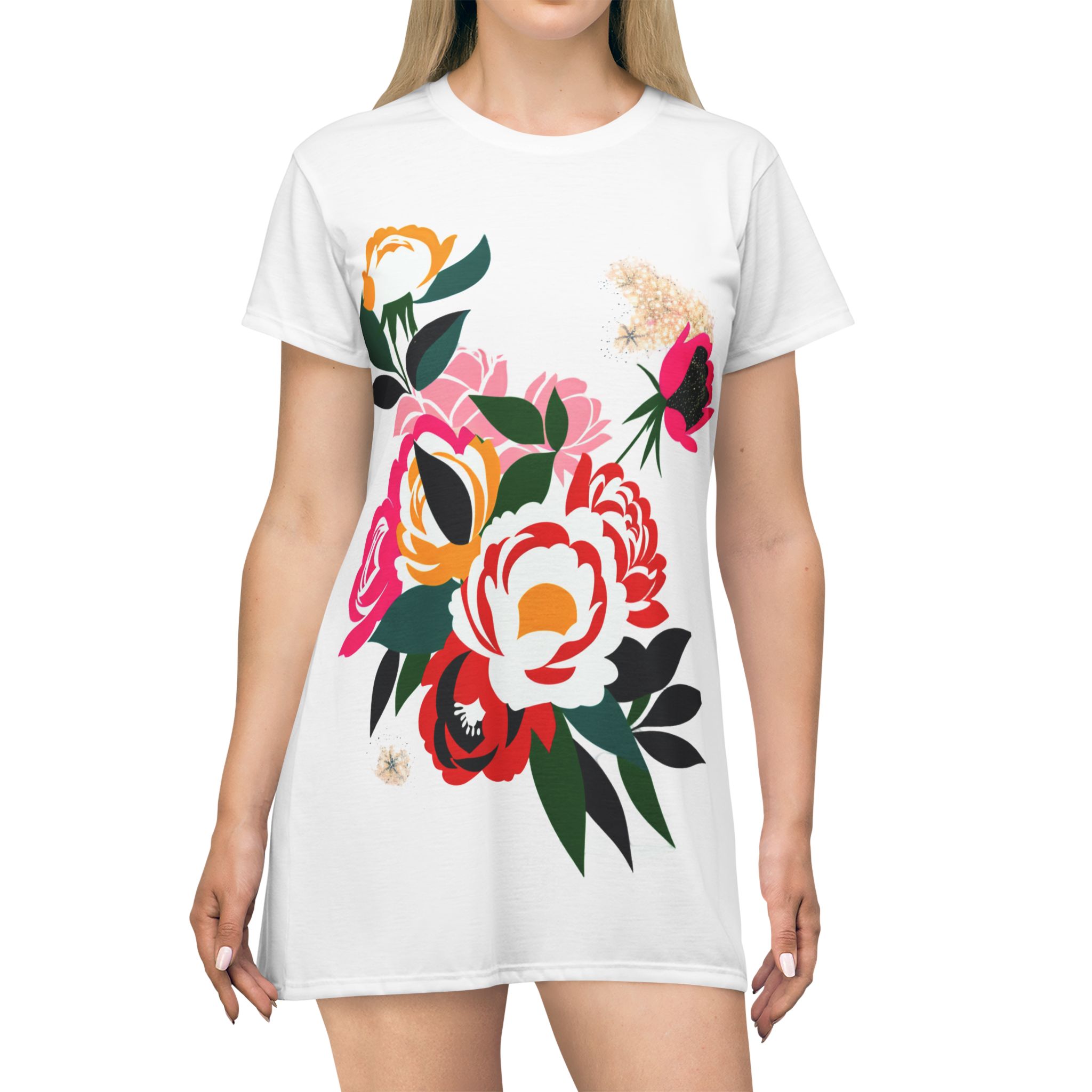 Bring your wardrobe to life with this stunning floral all-over-print T-shirt dress. Featuring a vibrant and colorful flower design, this dress is perfect for adding a touch of elegance and fun to your everyday look. Made from 100% polyester, it offers a lightweight and breathable feel, while the tagless design ensures ultimate comfort.