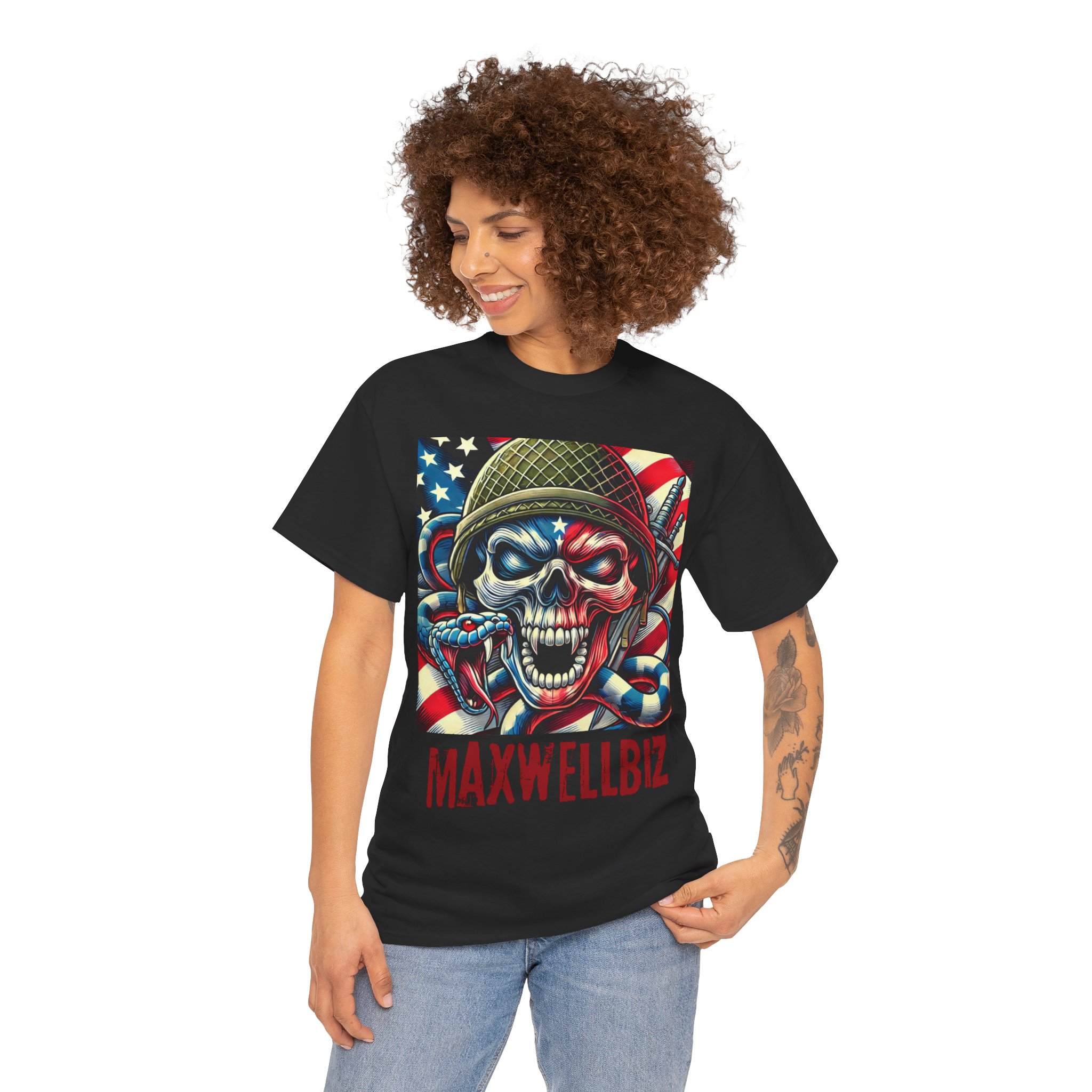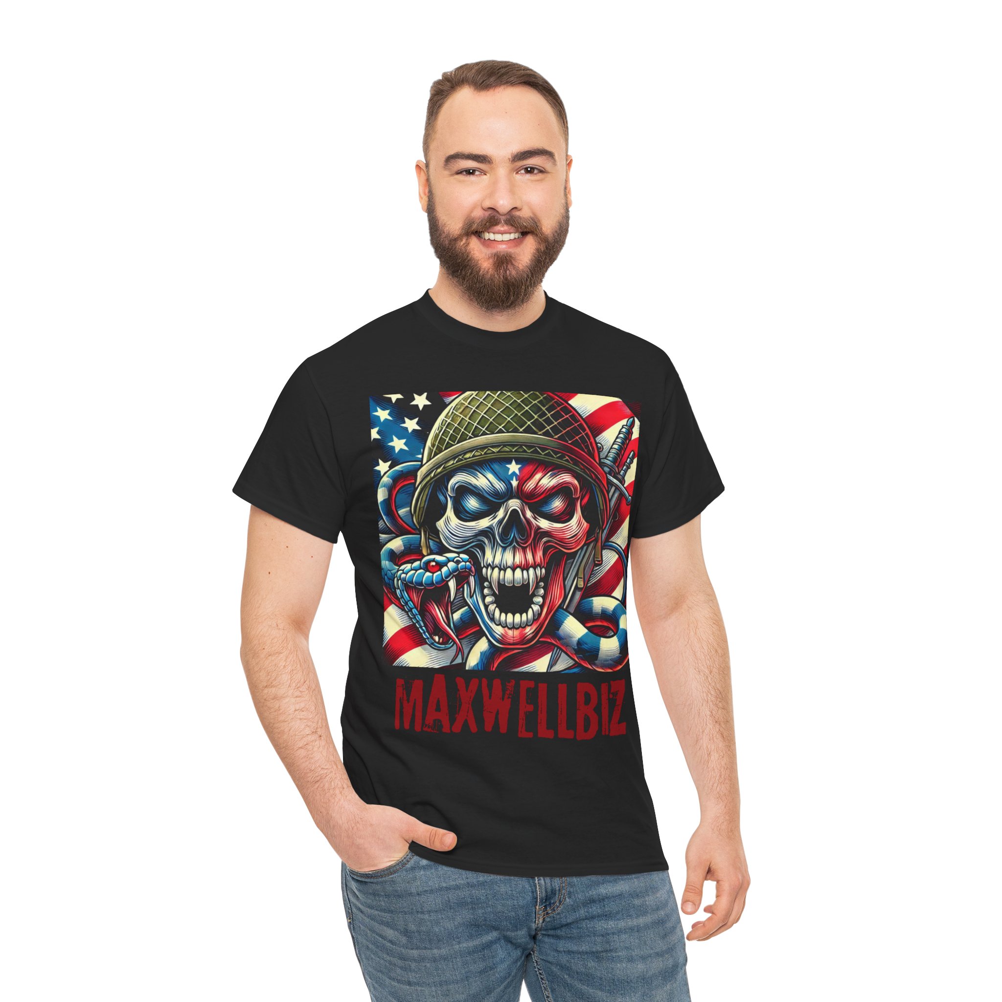 Show your fierce patriotism with the “MaxwellBiz Patriot Skull Snake Tee”. This design features a bold skull painted in the American flag, wrapped with a striking snake, embodying power, resilience, and rebellion. Perfect for those who want to represent strength and loyalty with a touch of daring style.