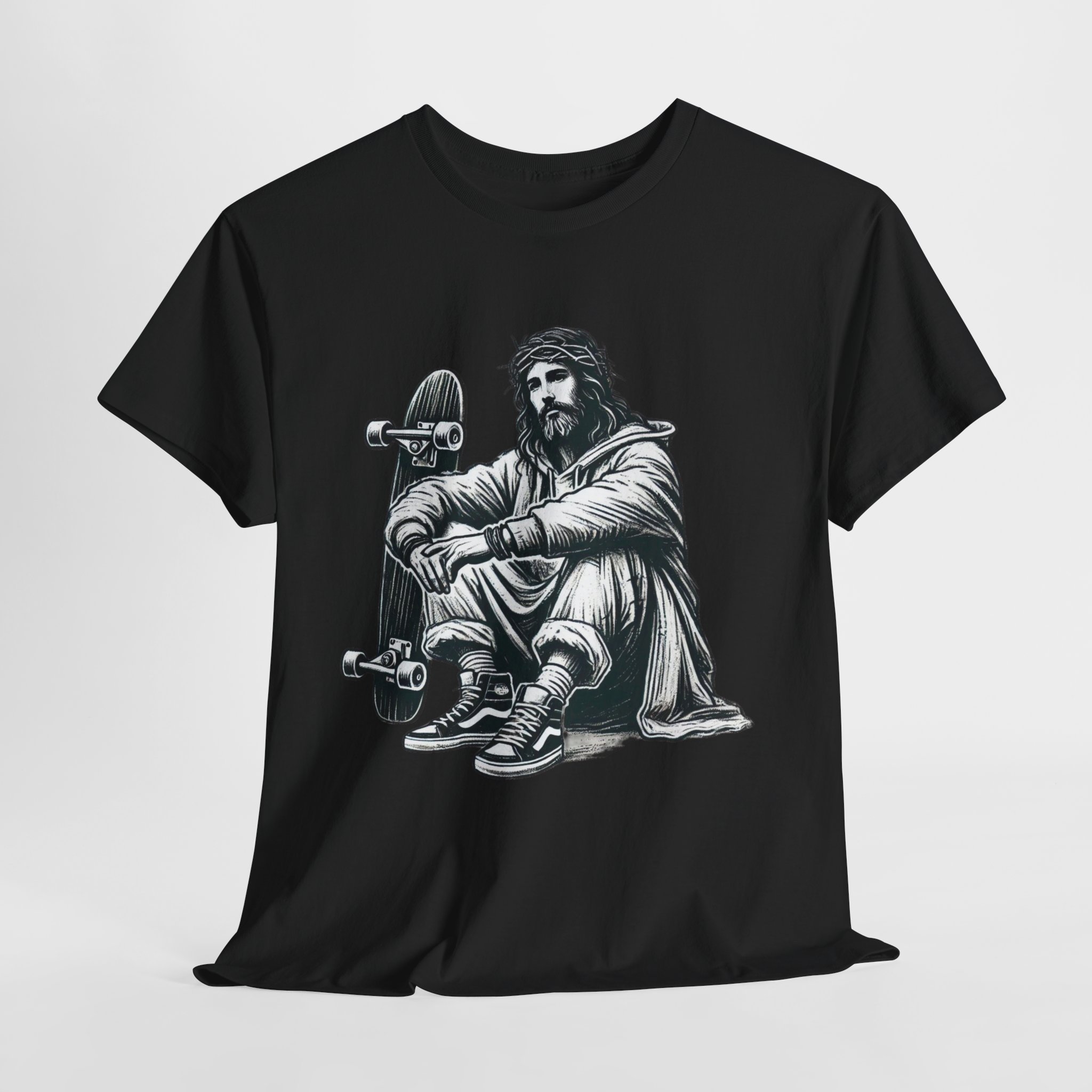 Step into the world of street culture and spirituality with the Skate Savior graphic tee. This design features Jesus Christ, casually seated with a skateboard, blending timeless faith with modern urban vibes. Whether you’re hitting the skate park or just want to make a bold statement, this shirt is perfect for those who believe in riding through life with purpose and style.